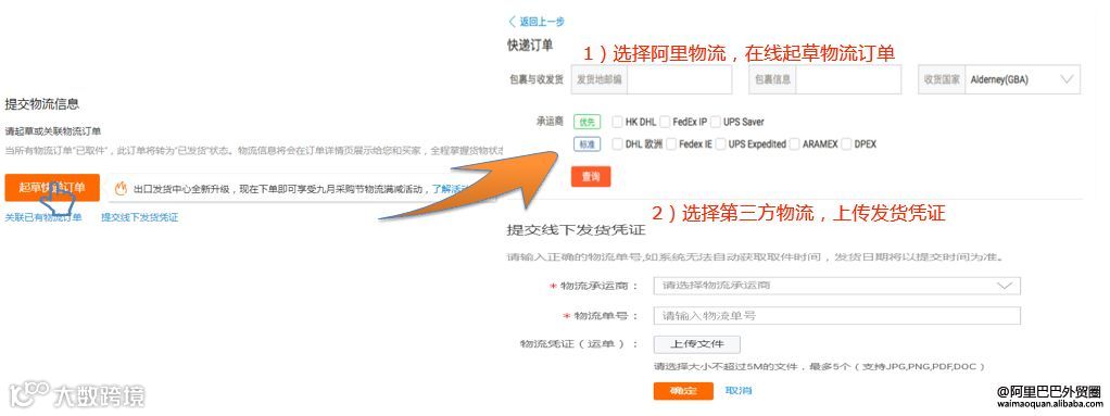 1)选择阿里国际物流,在线选择承运商,直接起草快递订单;