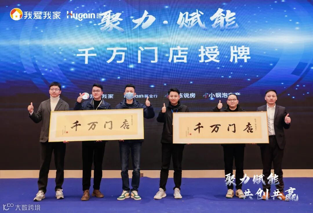 在发布会的核心环节,杭州我爱我家、汇金行和杭州小钢泡房产、老陈说房,达成了年度战略合作,同时进行了“千万门店”授牌仪式。