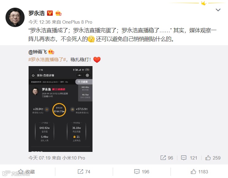 罗永浩第三场直播:热度指数下降,销售总额5715.9万元