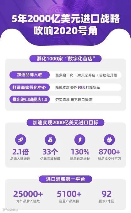 4月16日,天猫进出口事业群总裁刘鹏在天猫国际商家大会上宣布:2020年通过加速海外品牌入驻、打造国际商家孵化中心、推出进口旗舰店1.0这三大策略,孵化更多海外品牌的“数字化首店”,全力推进阿里巴巴5年2000亿美元大进口战略。为加速海外品牌入华,天猫国际简化流程,提升审核、入驻、备案效率。特设专职团队为商家提供一对一的中英文入驻服务,并上线自助入驻系统。保障商家入驻一次跑通,30天开店。