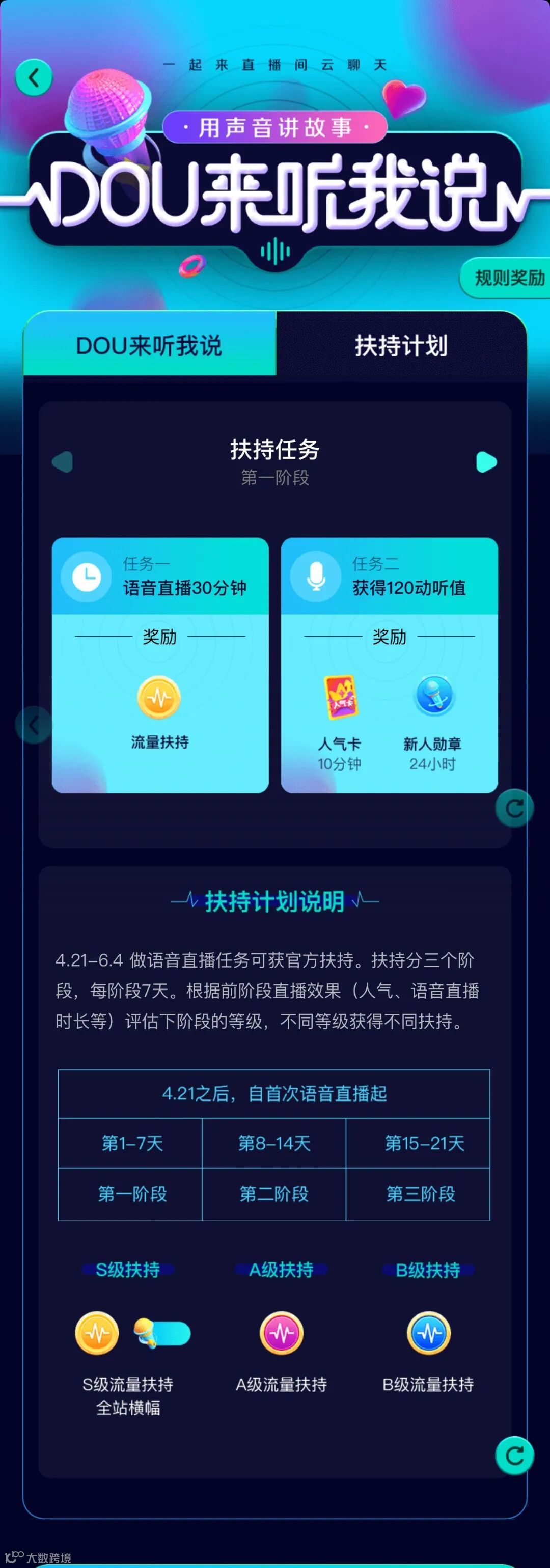 4月21日,抖音启动为期三周的语音直播扶持计划“DOU来听我说”,根据每日开播时长和动听值,达人有机会获得S级流量扶持。