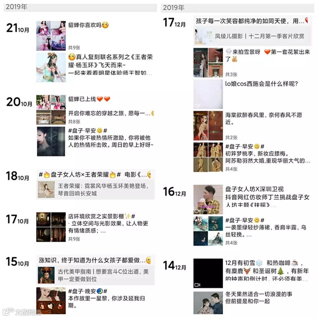 具体来说,盘子女人坊设定的朋友圈内容方向是“好看,圆梦,让每位女性都有一套属于自己的中国风艺术写真”。在朋友圈里,用户看到一张又一张华美的古装照。