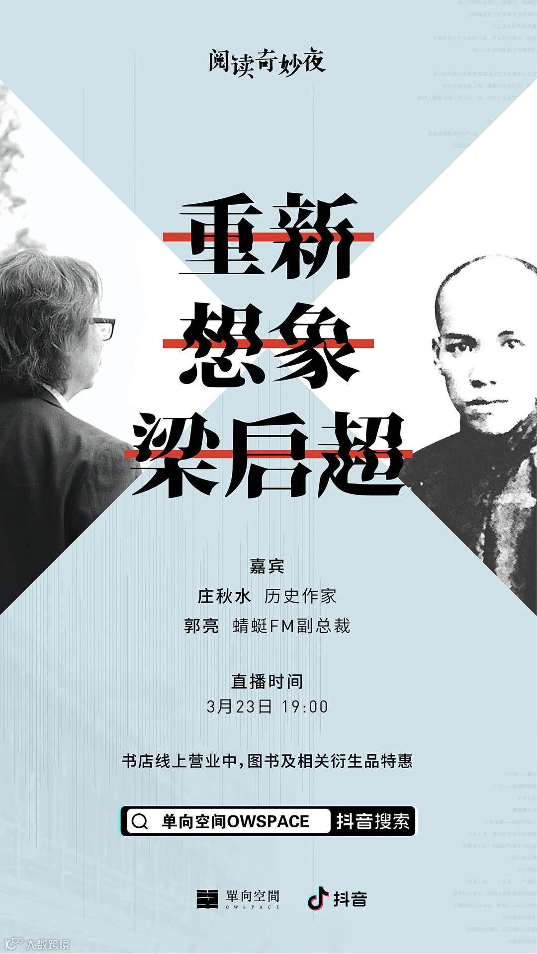 3月23日晚上7点,单向空间在抖音开启直播,历史作家庄秋水和蜻蜓FM副总裁郭亮一起聊《青年变革者:梁启超 1873-1898 》和《重新想象梁启超》背后的故事。