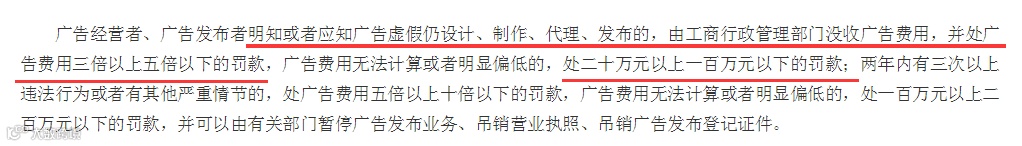 “明知或者应知广告虚假仍设计、制作、代理、发布的,处广告费用三倍以上五倍以下的罚款。两年内有三次以上行为,最低处一百万元以上二百万元以下罚款。”