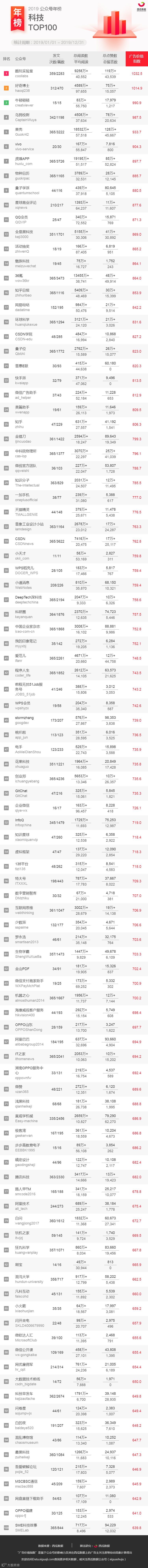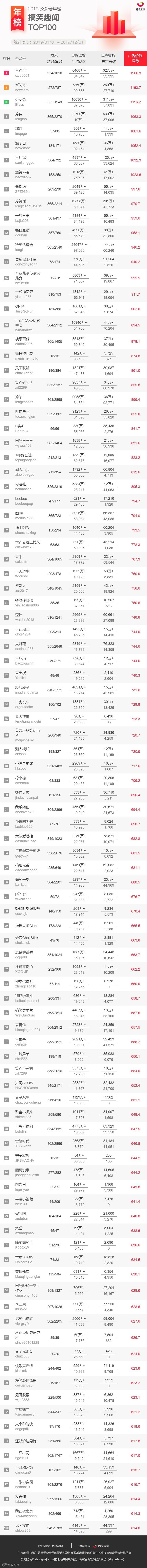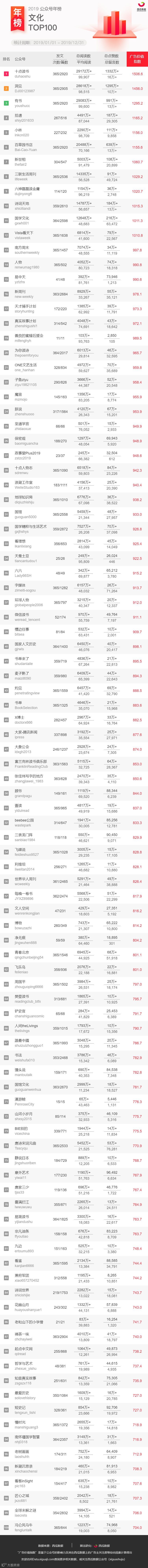 西瓜数据发布 2019 年微信公众号行业年榜,分别从广告价值指数、周期内公众号发文次数、发文篇数、总阅读数、平均阅读数、总点赞数、总留言数等方面进行展示公众号数据,这些维度的添加方便大家直观对比公众号整体的数据情况。