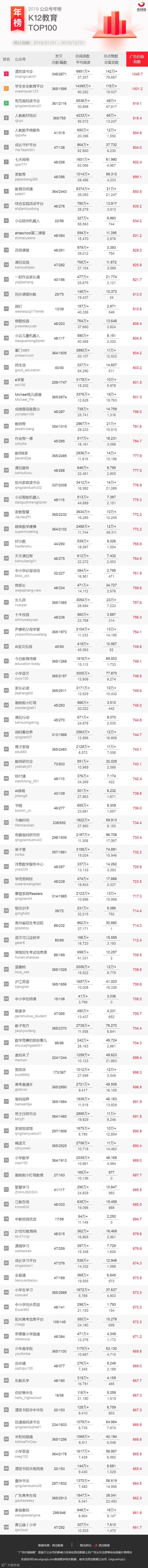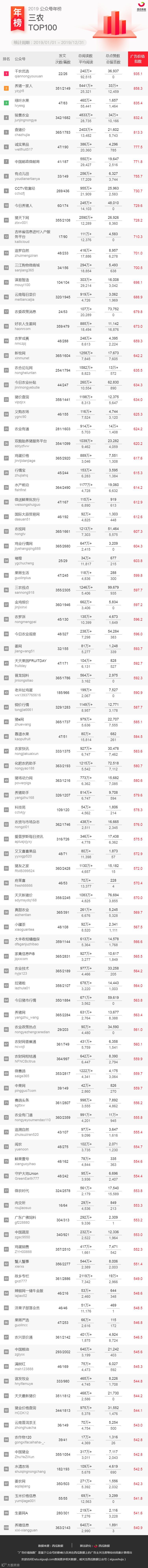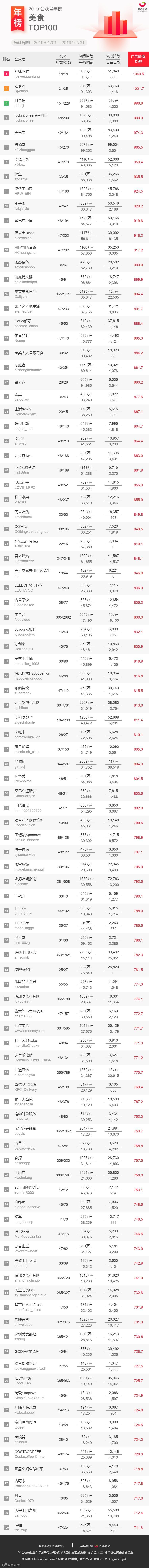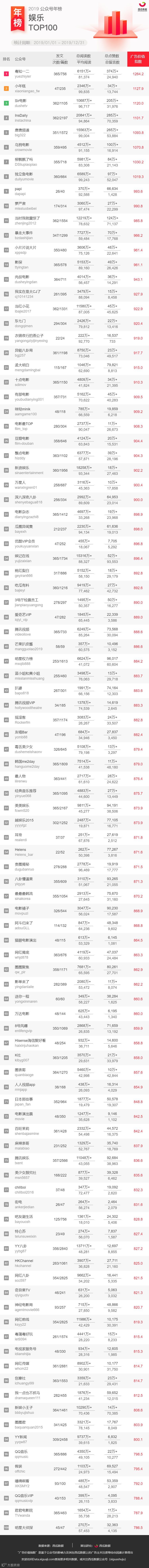 西瓜数据发布 2019 年微信公众号行业年榜,分别从广告价值指数、周期内公众号发文次数、发文篇数、总阅读数、平均阅读数、总点赞数、总留言数等方面进行展示公众号数据,这些维度的添加方便大家直观对比公众号整体的数据情况。