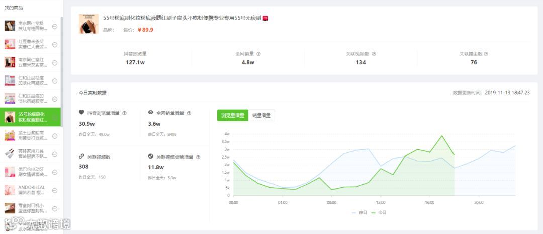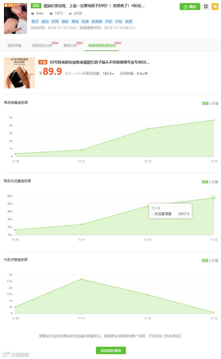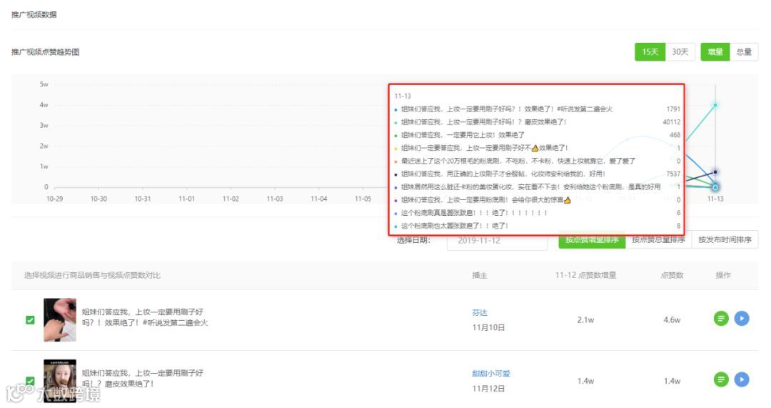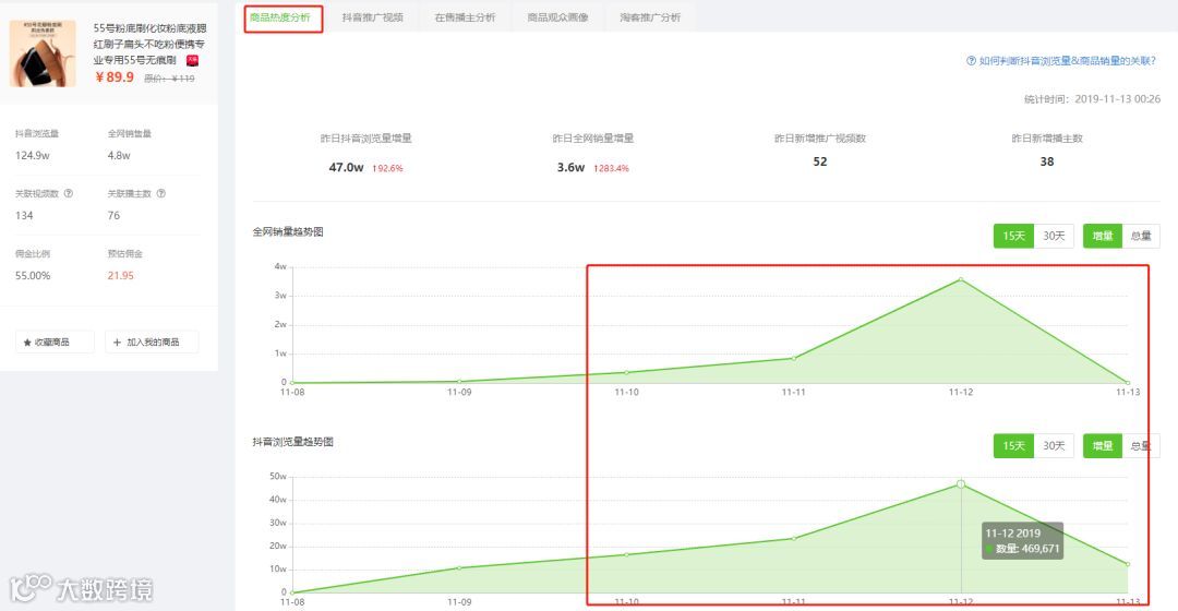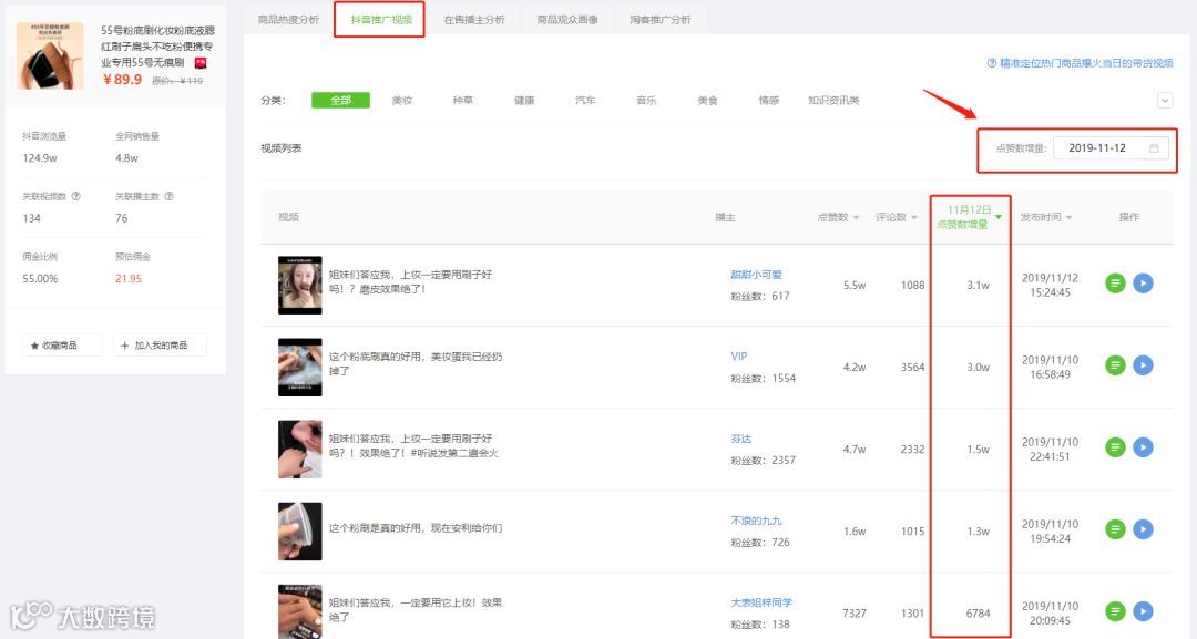 接下来,我们以商品销量增量最多的12号为例,分析究竟是什么推广视频让“粉底刷”瞬间刷爆抖音的!