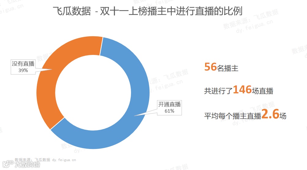 根据飞瓜数据的播主“直播记录”,在双十一期间上榜的92名播主中,有56名播主在此期间内有开直播,共进行了146场直播,平均每个播主直播2.6场。