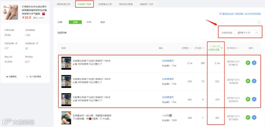 我们看到了“加绒打底裤”关联商品的视频中「哎呦喂傻笑」的视频在双十一当天点赞增量最高,达到了2.1万,而且其他点赞量有明显变化的视频也都来自他的视频,可推断商品浏览量的增量主要来自该视频带量。