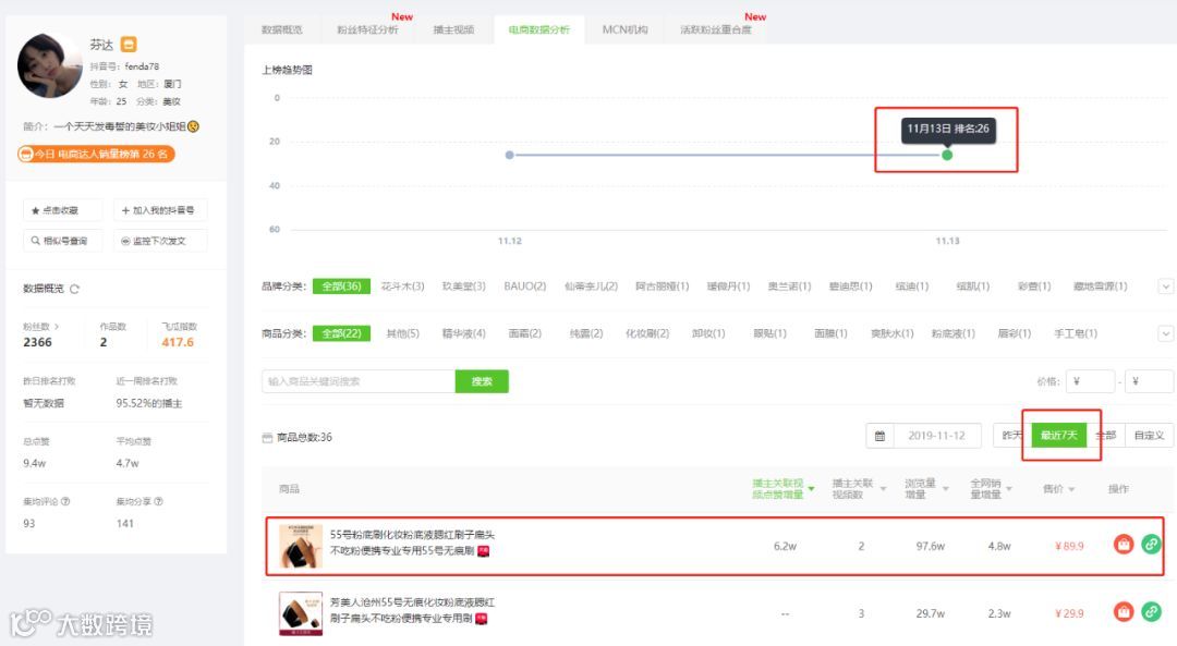 同时,我们查看「芬达」近期的电商数据可以发现,仅有2000粉丝的她在13号登上了抖音电商达人销量榜的第26名。