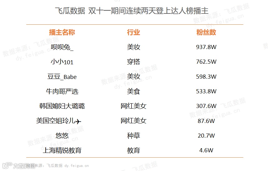 其中8位带货播主在双十一(11.11-12)期间,连续两天登上抖音电商达人榜成为抖音双十一带货主力军,他们推荐的商品主要以女性用户为主,主推美妆、穿搭品类。
