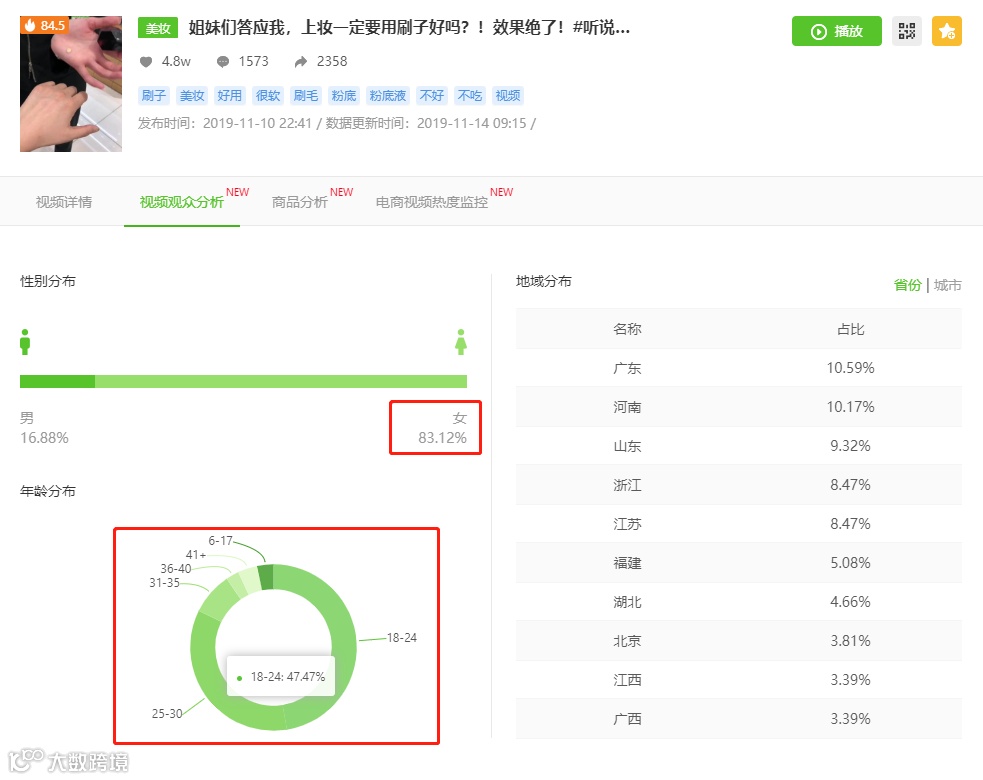 同时通过视频观众分析我们可以发现,这视频内容吸引了大量的女性用户,而且粉丝年龄集中在18-30之间,她们对于正是“化妆刷”的用户,这说明视频本身吸引到的用户是非常精准的,能给商品带货带来很大的促进作用。