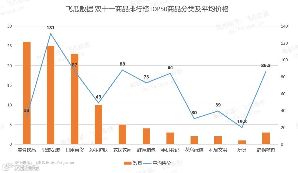 而在同步对比了双十一期间的飞瓜商品排行榜后,我们发现在商品排行TOP50数据中,第一阶梯依旧是美食饮品和男装女装。