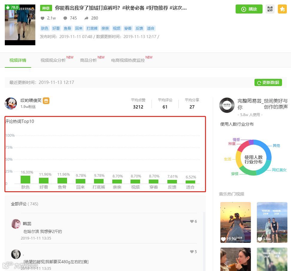 我们发现可以发现用户评论的关键词多以“好看”、“反馈”、“适合”为主,这些积极的评论,对视频推广和商品的成交都起到了很大的促进作用。