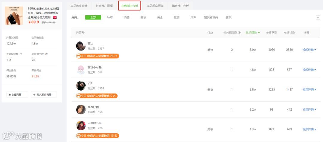 不仅如此,“粉底刷”还在短期内一次性带动了很多低量级的带货号上榜,可见优质的商品会自带流量。