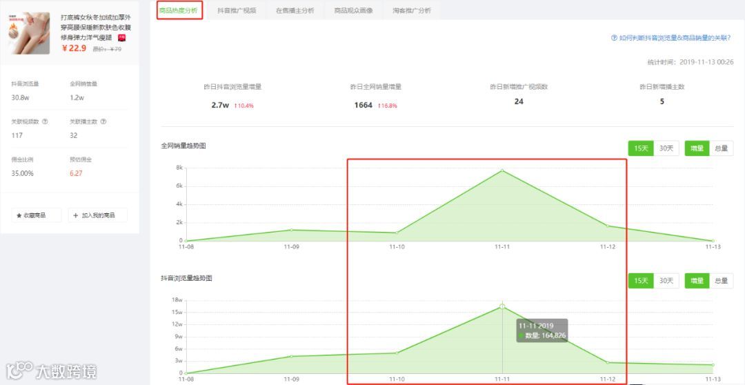 最近抖音上加绒的服装单品销量数据都比较惊人,我们选取在双十一当天上榜的“加绒打底裤”,通过飞瓜数据的【商品热度分析】对抖音商品有提前15天的浏览量和销量监控,还原商品的爆火历程。