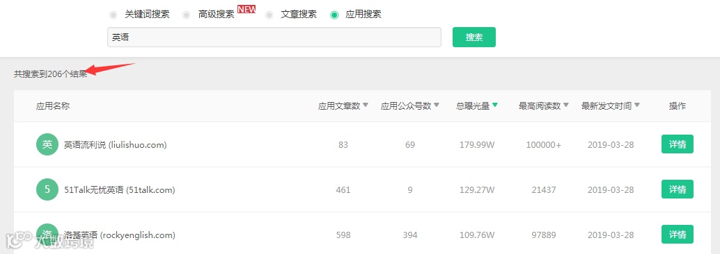 这里就会出现206个结果,你可以设置排序方式,可按照应用文章数、应用公众号数、总曝光量、最高阅读数、最新发文时间进行排序。