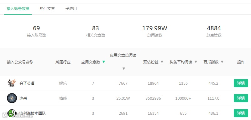 能看到有涉及到的公众号,并且可按应用文章数、应用文章总阅读、预估粉丝、头条平均阅读、西瓜指数,如下图。
