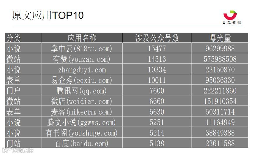 从1月到3月份接入原文应用的数据来看,被接入公众号最多的应用分别是“掌中云”和“有赞”商城,而曝光量最大的站点是“有赞”商城和“腾讯网”,曝光量分别达到5.76亿和2.22亿。前十中有4个席位都是小说类别。
