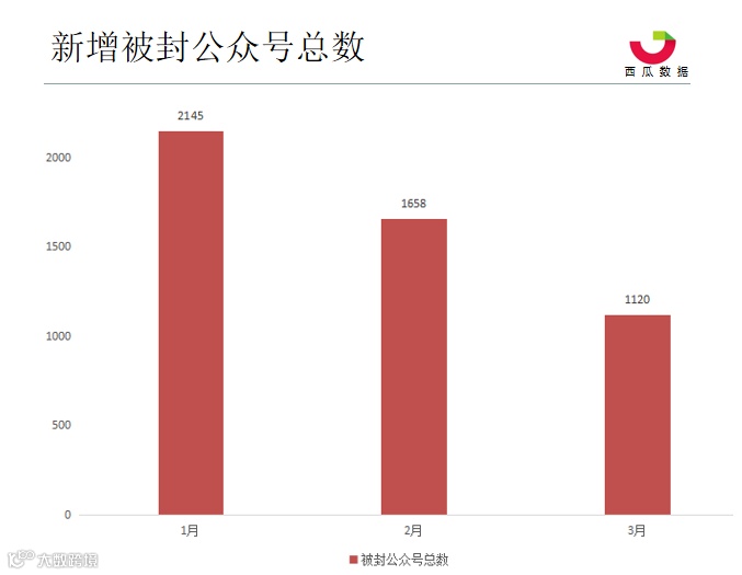 另一方面,在Q1季度里,每月新增被封公众号总数呈下降的趋势,说明在微信官方严格整治的环境下,低俗、恶趣、利诱分享的文章数在逐渐减少。从被封的公众号分类来看,情感和搞笑趣闻类的题材更容易出现违规现象导致被封号。