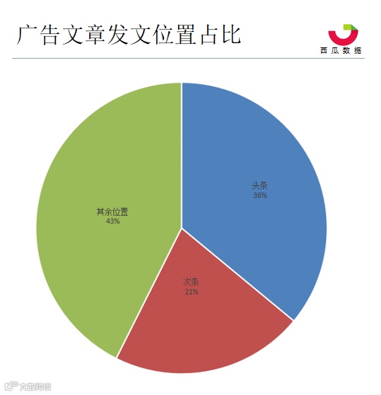整体广告投放量在经历2月份短暂下降之后3月份投放量略有增长。在每月广告文章中,头条广告文章数占比达到36%,次条占比21.4%,其余位置占比42.6%。