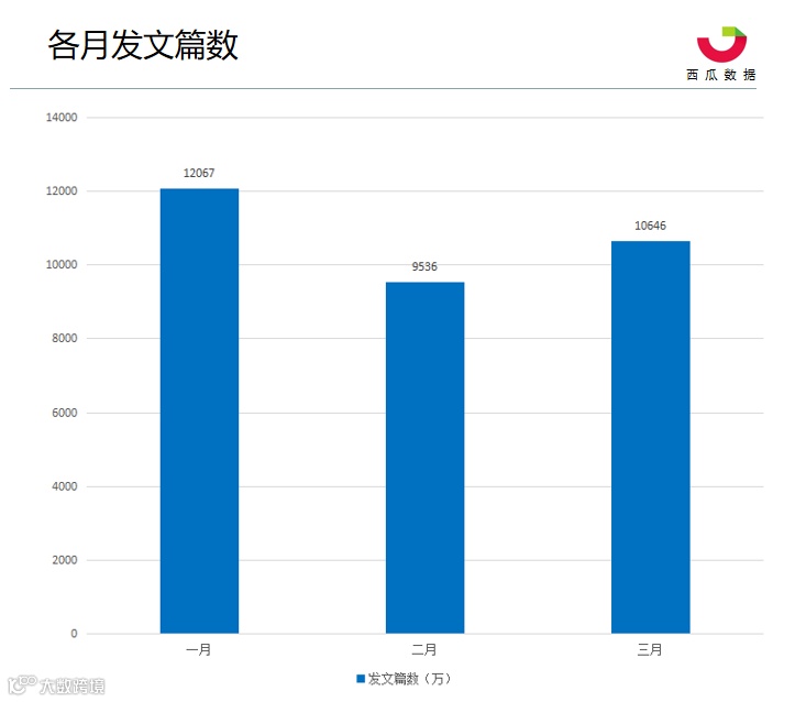 2019年第一季度 ,仍保持发文的公众号累计达175.6万个,累积发文量3.22亿篇,平均每月产出1.07亿篇内容。二月份受春节假日影响,实际发文篇数明显减少。