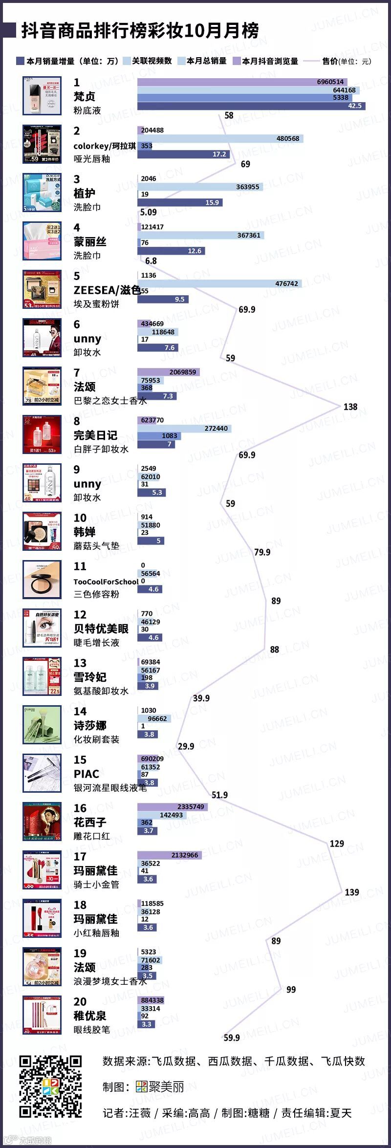 排名第一的梵贞、第六的滋色,紧接着的包括完美日记的卸妆水和花西子的雕花口红,都是抖音商品月度排行中的“老朋友”。