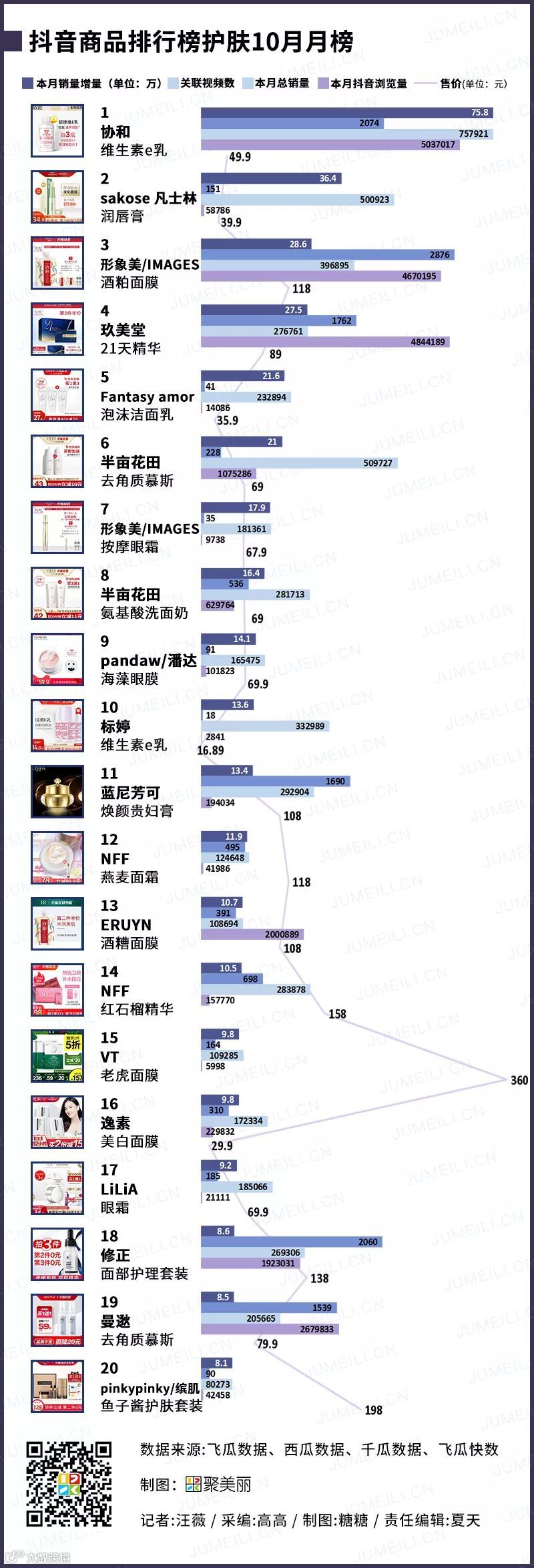 自9月的抖音护肤商品排行中仁和的祛痘印膏成为当月最高销量的产品,在10月,来自协和维生素E乳又以“老牌国货”为主要宣传词以及低廉的价格实现了一个月70万+的销售量。