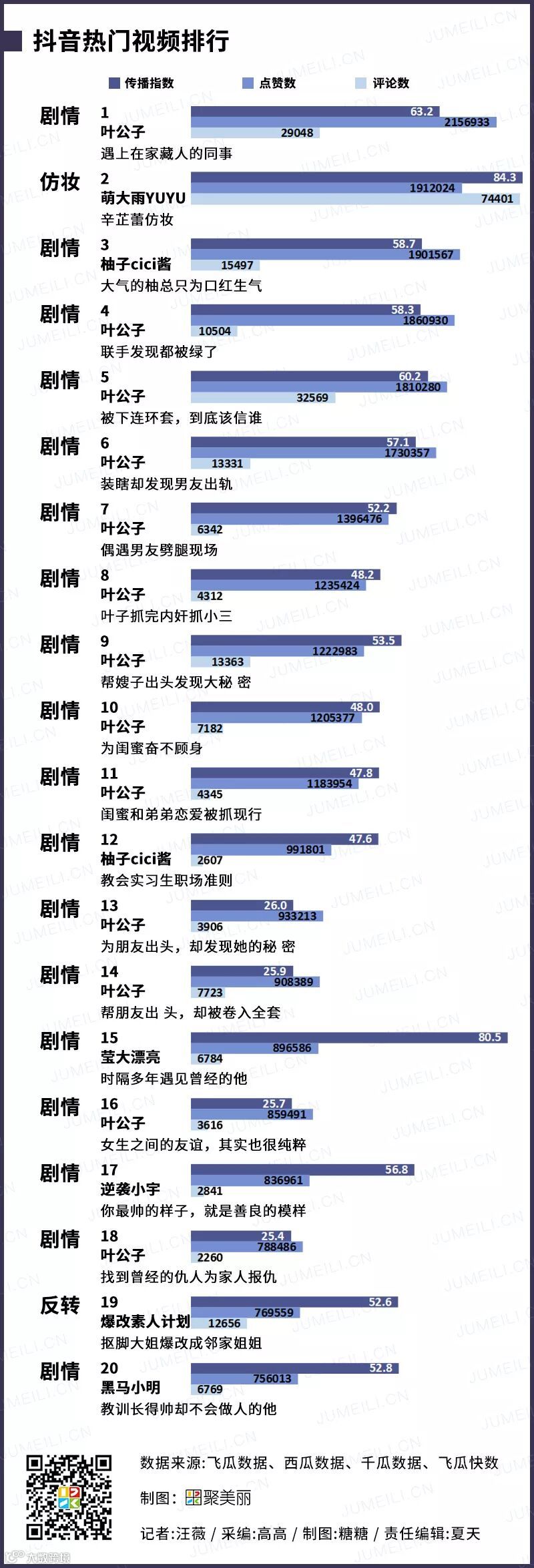 而结合下面的抖音热门视频榜单也不难看出,整体从浏览量、点赞数、评论数来看,剧情类播主依然是抖音中“打广告”、带流量、(甚至)带销量的一把手。