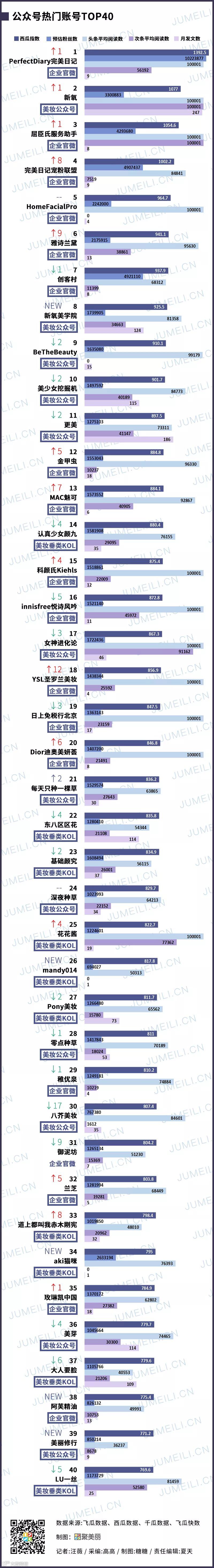 在本次10月公众号排行榜单的前半部分,集中着大量的企业官微和美妆公众号。