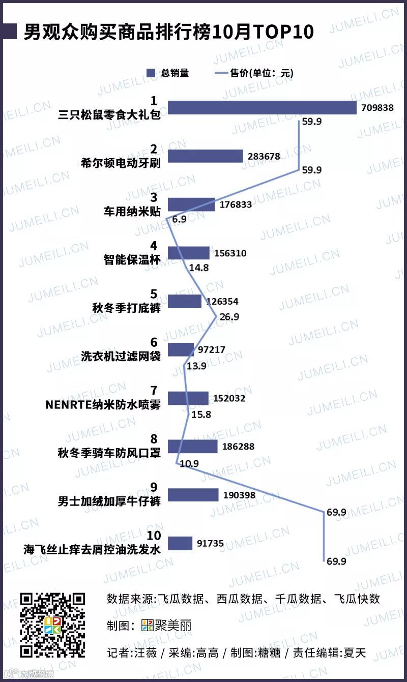 另外,如果将男女观众区别开,他们各自在10月购买最多的产品有哪些呢?