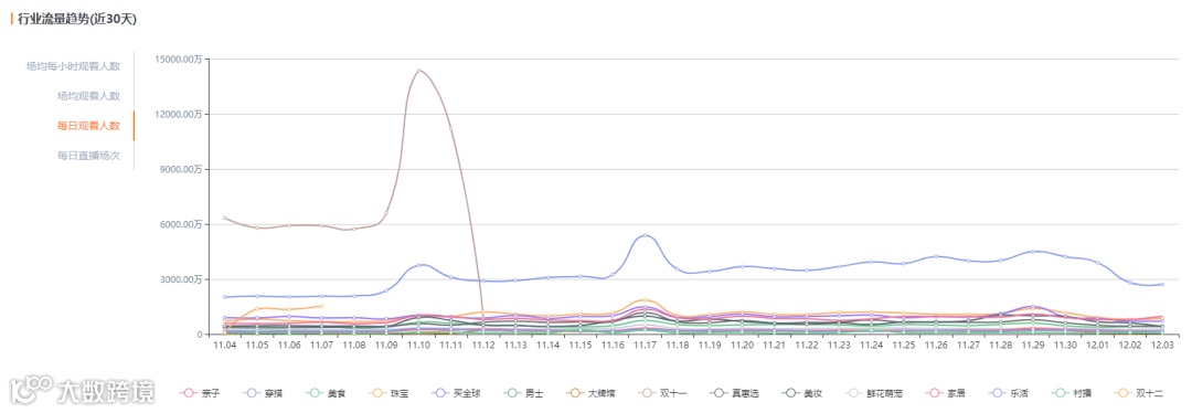 通过近30天的行业流量趋势图来看,除了双十一前后流量的爆发性增长外,“穿搭”在每日观看人数上都稳稳的高于其他行业,可见在淘宝直播这个大环境里现在最容易获得流量的还是是“穿搭”业。