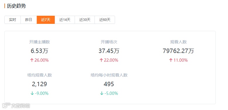 近一周,全网的流量都处于上升趋势,开播的播主有6.53万人,共开播了37.45万场次,观看人数也达到了79762.27万人,直播场次的增多也意味着场均观看人数就略微减少了一些。