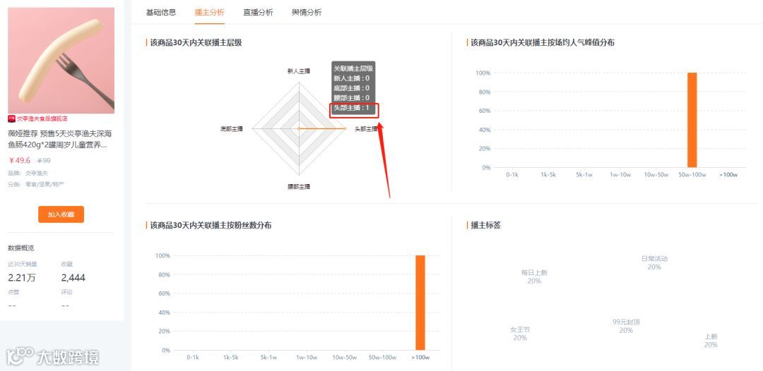 通过查看商品详情可以看到,该商品在30天内共投放36名播主,其中包括6位新人主播、29位底部主播、和1位腰部主播。