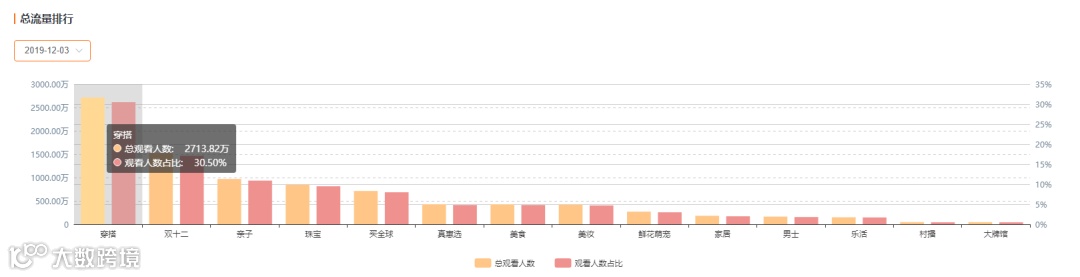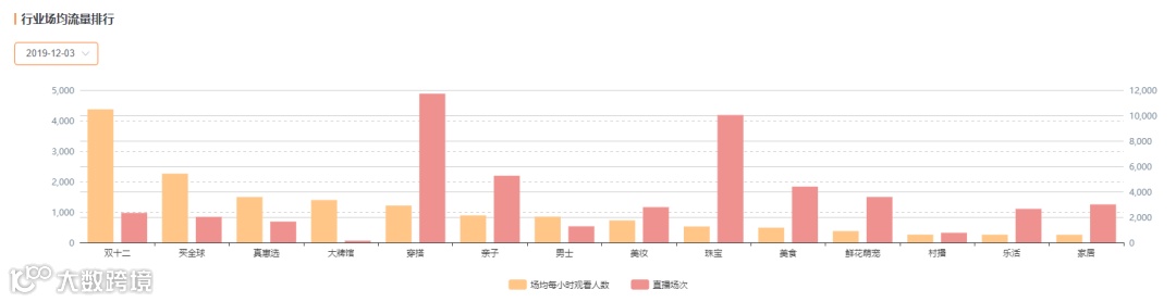 再看看总流量排行,双十二还没真正开始前,穿搭占总流量是30%上下,但通过数据可以看到。在场均每小时观看人数里,直播了11710场的穿搭,场均每小时的观看人数只有1210人,而场均人数最高的是双十二活动场的4367人。