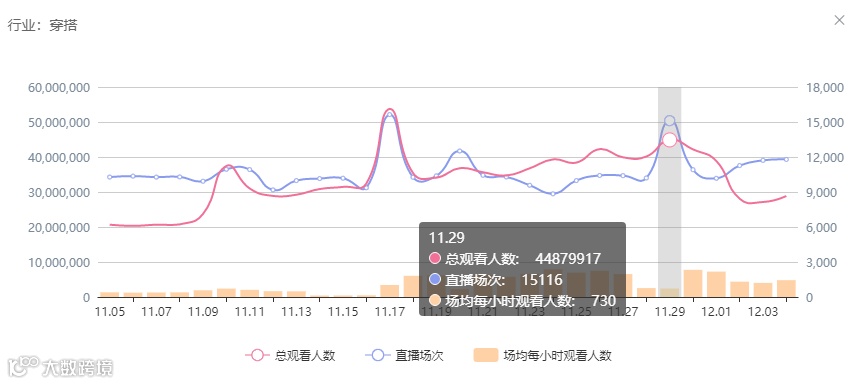 通过对穿搭的流量详情可以查看到,自11月17日起,每场的观看人数其实都在不断上升的,这些数据可以说明了,淘宝直播流量一直在上升,不管是双十二大促还是最受女性欢迎的“穿搭”行业,都处于一个良好的趋势下。