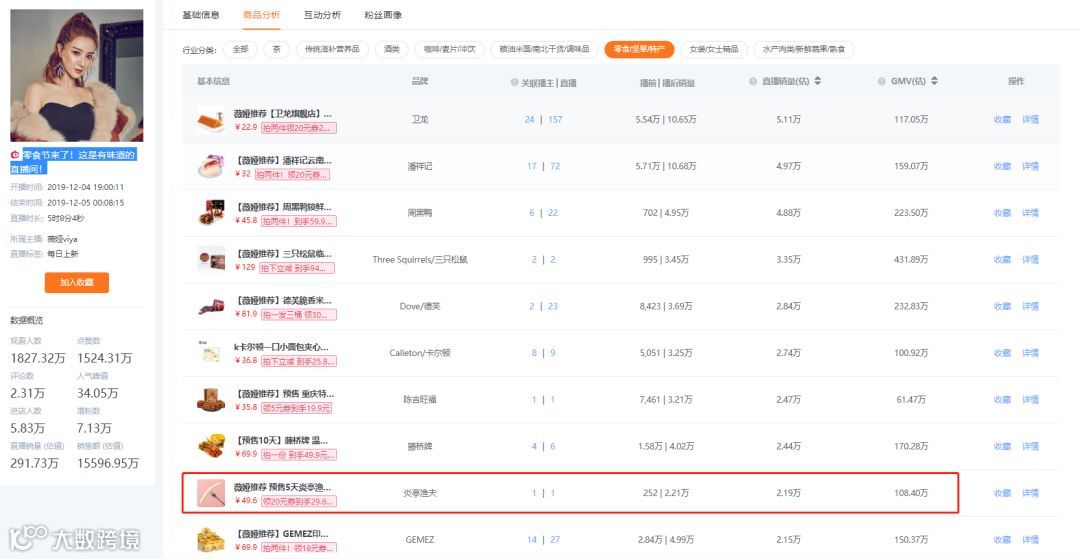 12月4日晚,通过在薇娅直播间《零食节来了!这是有味道的直播间!》的实时监测,发现了这么一件商品。