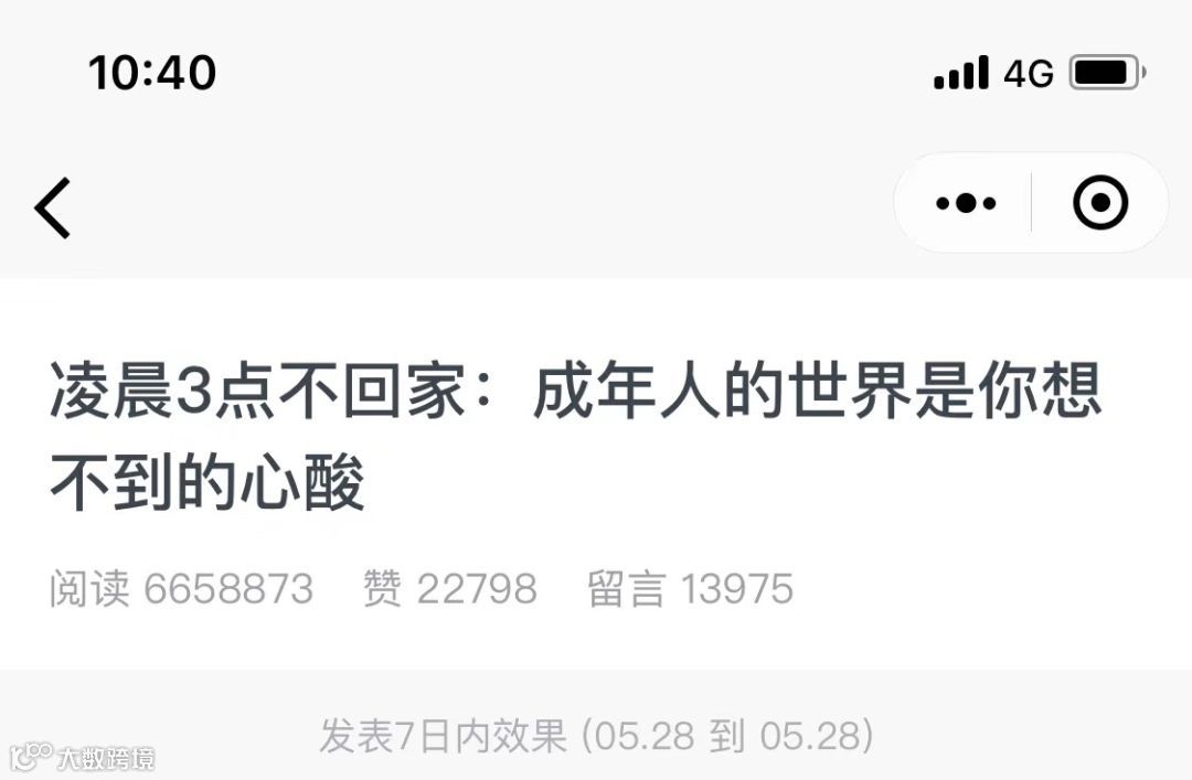 5月28日公众号“视觉志”发布的《凌晨3点不回家:成年人的世界是你想不到的心酸》在朋友圈刷屏,截止5月29日11点,一天时间阅读量已突破660万,点赞达到2w+,留言高达一万多条。