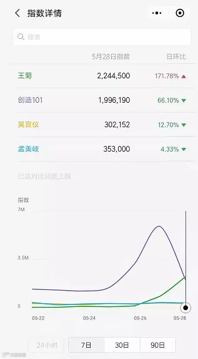 上周《创造101》选手王菊在各大平台爆火,从微信指数来看,王菊的热度已经超过很多流量明星,29日的指数已突破千万,日环比增长达到453%。