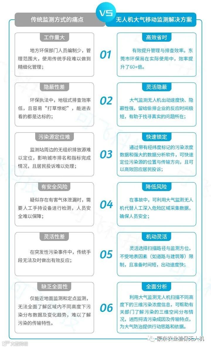 由于大气污染具有“涉及区域范围较大、区域之间污染物传输量大、污染源种类多、污染因子相对复杂”等特点,传统环境监测方式很难确定污染发生的直接源头,而采用无人机搭载小型大气移动监测设备,对特定区域的空气污染情况进行三维扫描,并实时生成直观的可决策信息,可帮助环保部门针对性地解决下述痛点:
