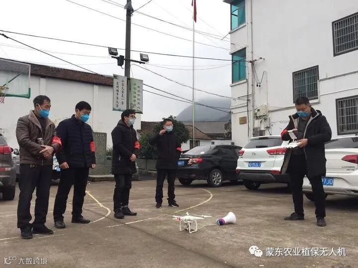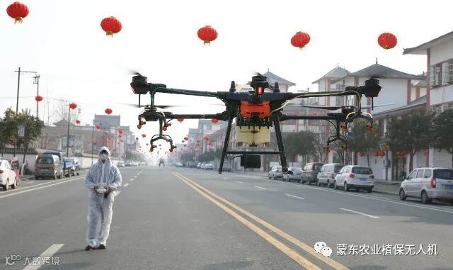 在疫情防控的关键时期,为了控制疫情扩散传播,借助无人机配合地面防疫人员,对镇区进行空中防控消毒作业。