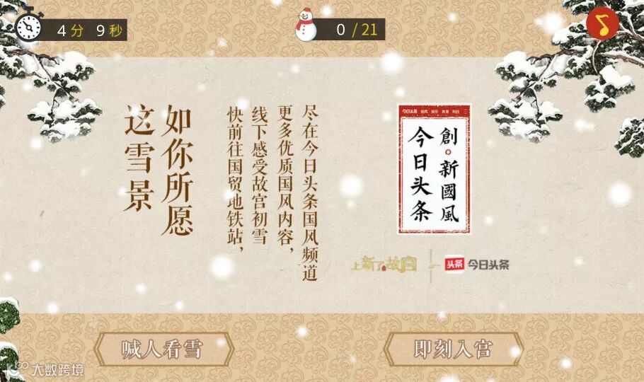 在第一支释出的《上今日头条,看故宫初雪》H5中,淘气的阿哥们在宫中角落堆了21个雪人,难倒了扫雪的小太监,请求网友支援找雪人。在动态呈现的这幅令人惊艳的故宫雪景中,人脸识别入宫门、平衡车巡逻、VR装置……现代科技另类穿越呈现。今日头条的科技、动漫、特卖、电影等频道以及国风内容完美植入,最终实现为《上新了·故宫》及线下《故宫雪景长卷图》导流。
