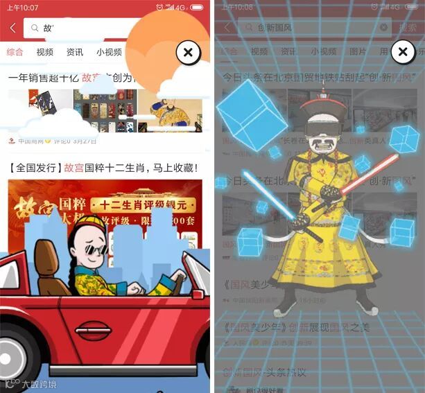 为了给《上新了·故宫》节目传播造势。在今日头条端内搜索栏输入“上新了故宫”、“故宫文创”、“故宫国风”、“创新国风”等关键词,还将出现故宫相关的彩蛋特效,世界各地到处旅游、剪刀手拍照的格格;故宫门外呆坐一天悠闲自在的御猫“鲁班”;开跑车戴墨镜到处溜达的阿哥;头戴VR高科技玩的不亦乐乎的皇帝。四个彩蛋特效分别对应今日头条内旅游、国风、汽车、科技四大频道的特色。