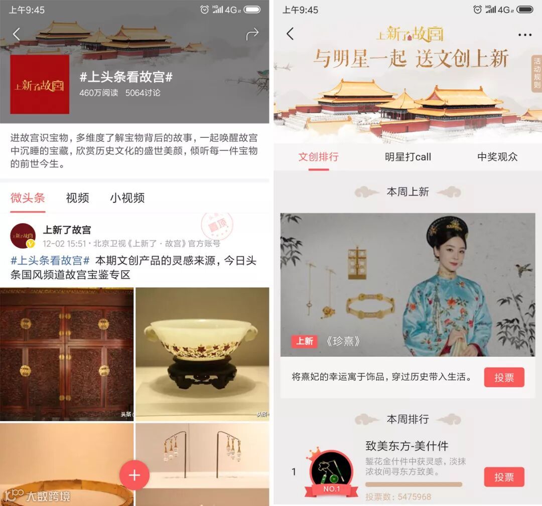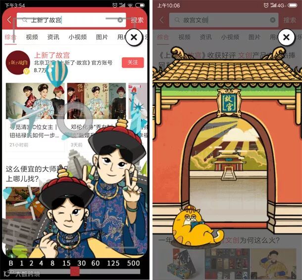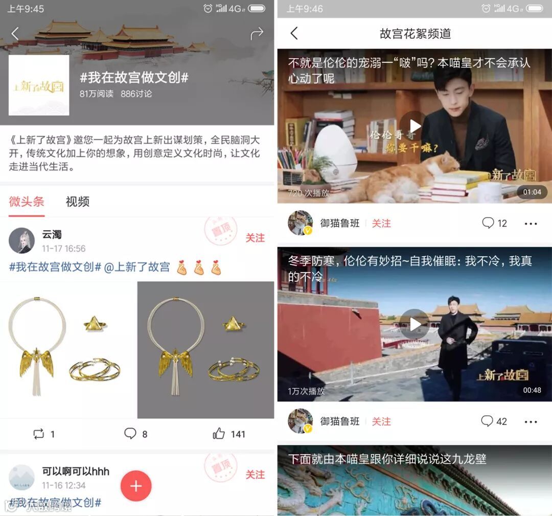 本次与《上新了·故宫》节目的战略合作,还专门针对节目设置了故宫定制专区,呈现包括与明星一起送文创上新的“投票通道”在内的四大版块;“故宫宝鉴”:进故宫识宝物,让用户更多维地了解宝物背后故事;“创意投稿”邀请用户一起脑洞大开,为故宫上新出谋划策;“花絮集锦”则由御猫鲁班发布节目花絮集锦,独特趣味撸猫视角嗨翻网友。这四大版块也使今日头条的国风频道成为节目互动的一大阵地。