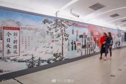为了承接线上传播的热度,今日头条在北京国贸地铁站展出了一幅总长135米的故宫雪景长卷图,把故宫初雪从线上搬到了线下。