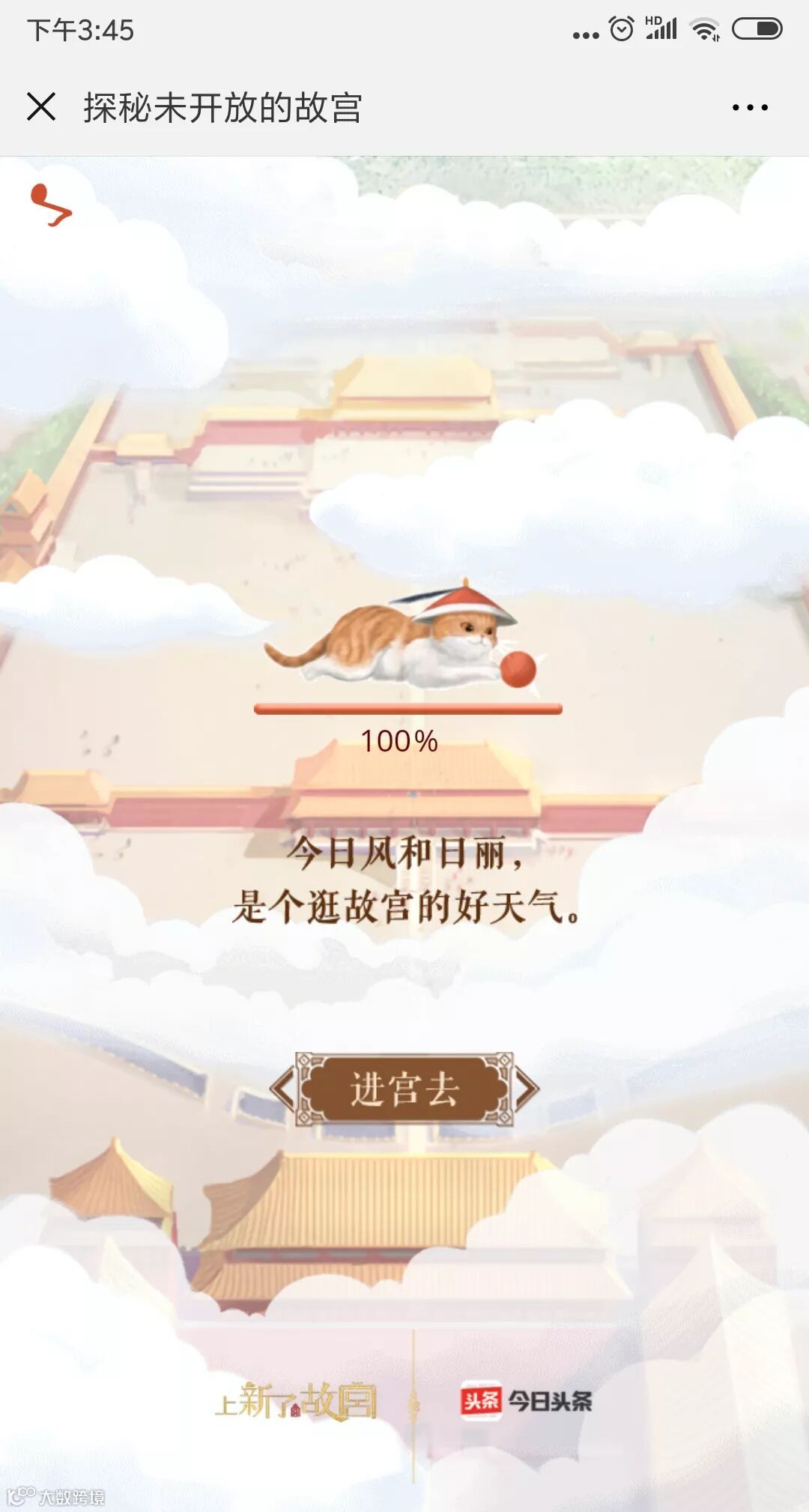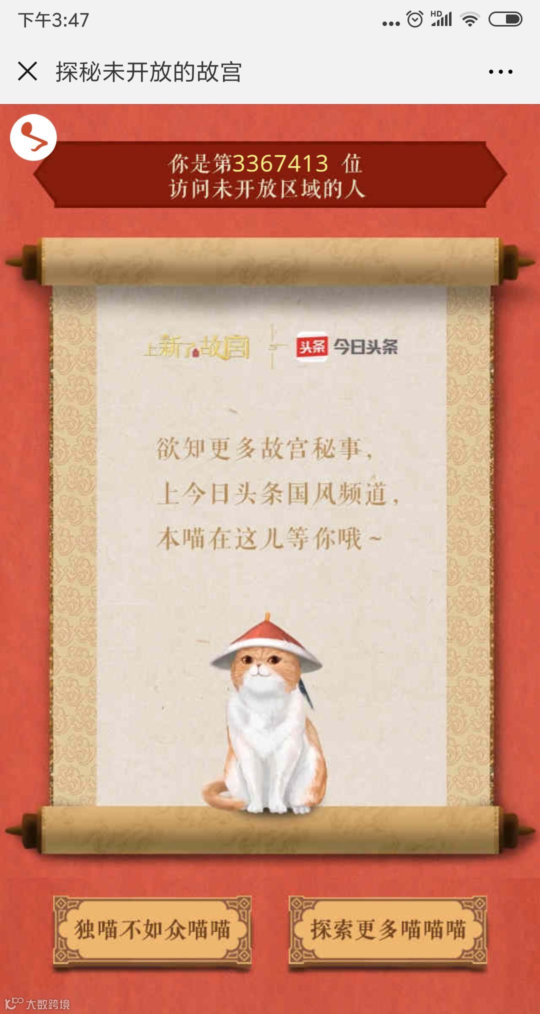 在第二支《探秘未开放的故宫》H5中,《上新了·故宫》中的御猫“鲁班”化身导游,以它的视角带领大家探秘故宫中未对游客开放的20%,这样的噱头着实吸引了大批用户的分享、观看。
