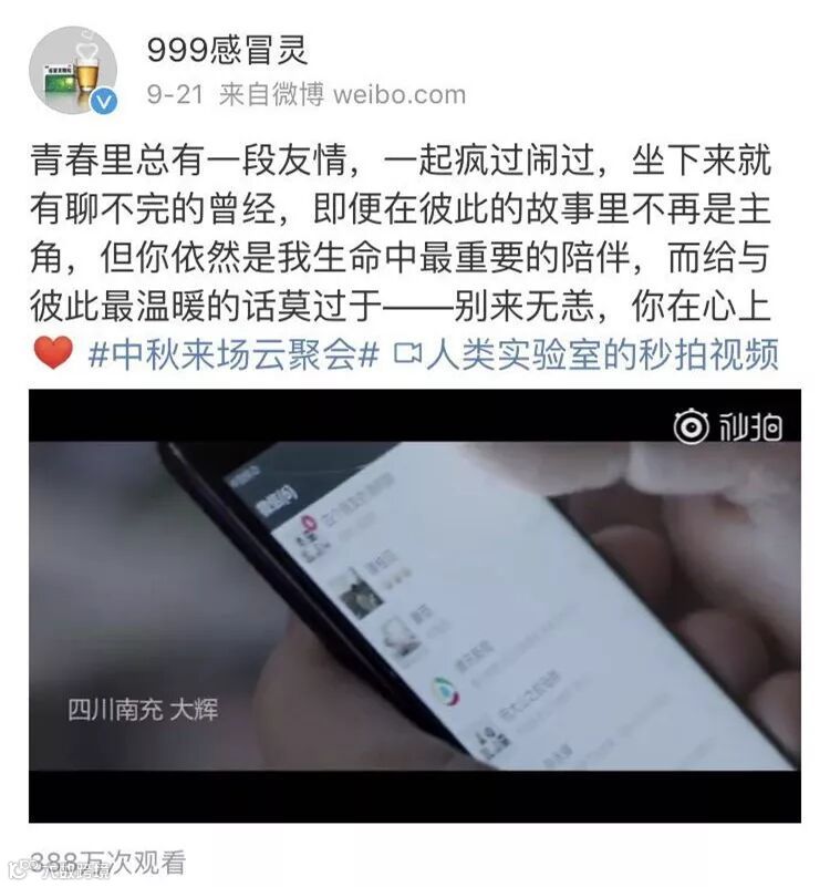 并且,999的每一次广告中都基本上没有露出过产品信息,只在结尾点名主题时,才知道是999的新广告,这就减少了受众对品牌植入的不适感,反而得到大量的称赞。