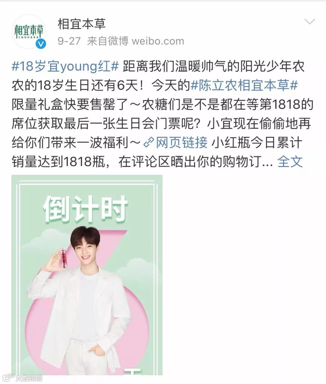 一来,相宜本草与陈立农成功牵手后,组成“18岁cp”,将自身18年执着研发中草药护肤,始终不忘初心的品牌形象与18岁青春无敌,未来可期的人气偶像陈立农的形象融合。不仅使品牌形象更加凸显,也进一步加深了与代言人以及粉丝之间的情感联系。