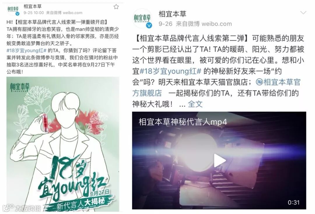 相宜本草此次推出自己的新代言人,有别于传统的营销思维,并不是“有一说一,有二说二”的直肠子卖广告,而是通过前期抛出一个大概的偶像人物轮廓及神秘视频,让粉丝们自己去猜测新晋的代言人究竟是谁,借助悬念引爆关注,卷入消费者关注。果然,海报与视频一经上线,就引起了微博网友的热烈讨论。
