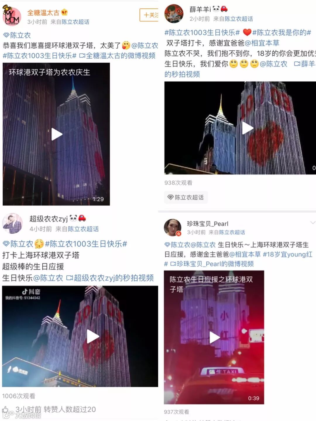 10月3日当天是当红偶像组合NINE PERCENT中的陈立农生日。晚上19:30至20:00,在上海地标性建筑环球港的双子塔上,播放起了长达半小时的应援,从各地赶来的浓糖们,纷纷在其附近打卡发博。